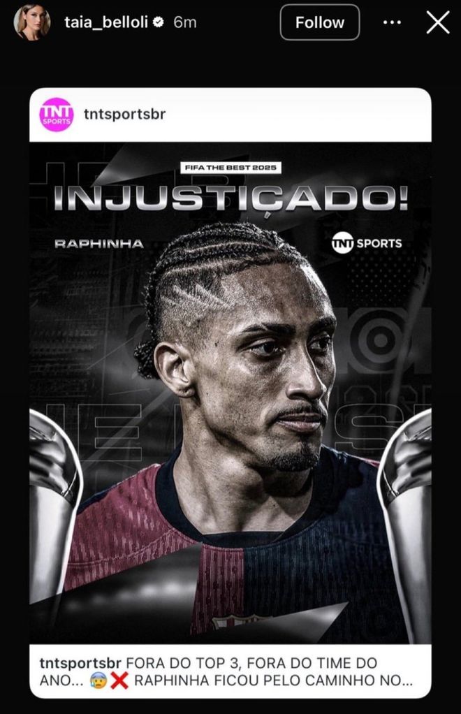 拉菲尼亚的妻子泰娅在个人社交媒体上,连发四条动态炮轰奖项的不公:“他们现在连演都不演了!”;“直接参与62个进球,但他不配入选最佳阵容。”;“国际足联如此不公正!”;“拉菲尼亚是篮球运动员吗?!”